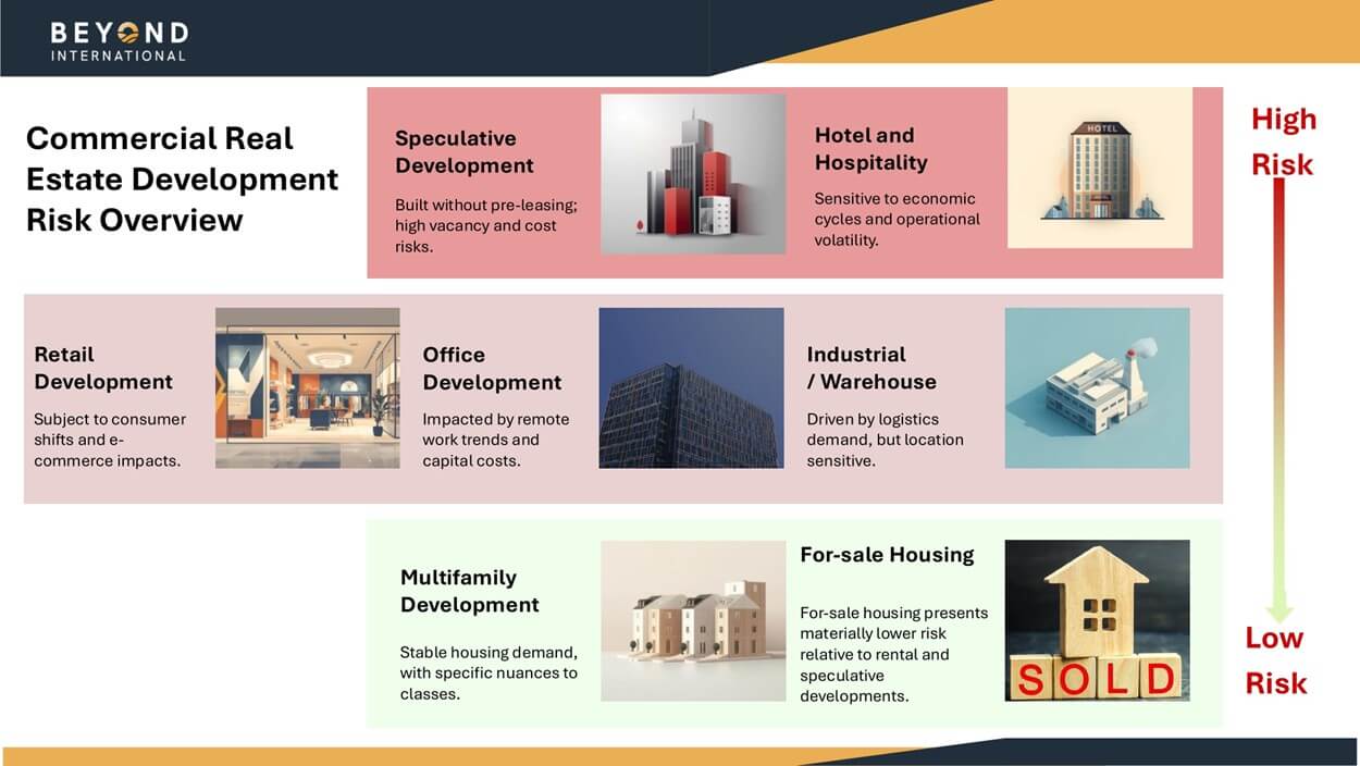 风险谱系很重要。投机性开发和酒店/旅游项目处于最高风险水平——退出的不确定性最大。待售住宅则处于较低风险端。人们始终需要住所,建成后的单元可以逐套出售,传统贷款机构也更愿意为此类项目提供融资。